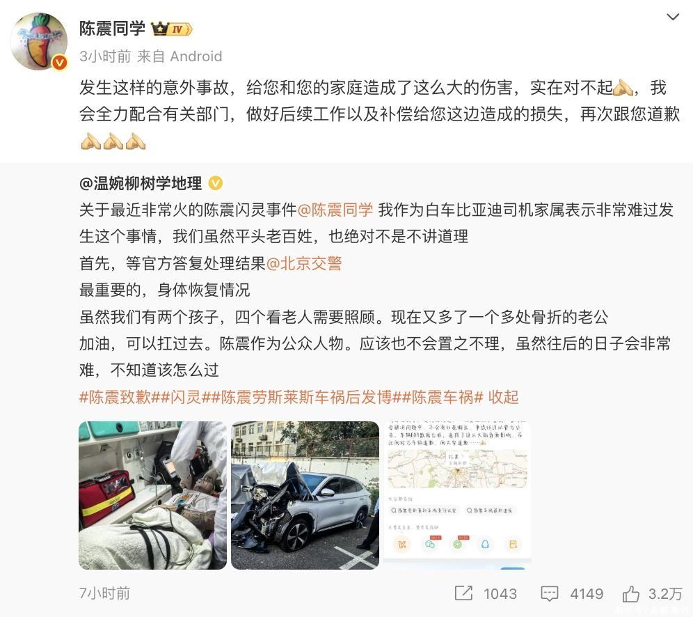 随后,陈震转发该条帖文并致歉称,“发生这样的意外事故,给您和您的家庭造成了这么大的伤害,实在对不起,我会全力配合有关部门,做好后续工作以及补偿给您这边造成的损失,再次跟您道歉。”